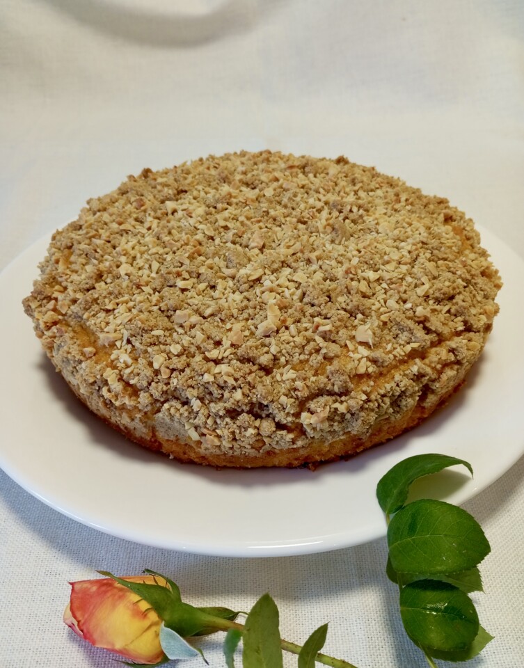 - Verta a massa na forma. Distribua a mistura do crumble sobre a superfície da massa e finalize com a amêndoa picada. Leve ao forno por cerca de 40-45 minutos. O bolo estará pronto quando inserir um palito no centro do bolo e este sair seco.